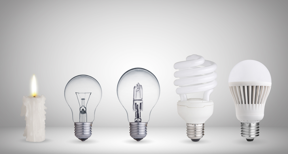 Hier links zien we de evolutie van lampen. Met als 1ste lamp een gloeilamp en als laatste een ledlamp.